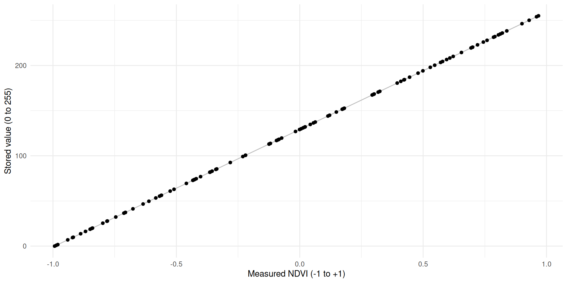 labs(x = "Measured NDVI (-1 to +1)", y = "Stored value (0 to 255)") +
