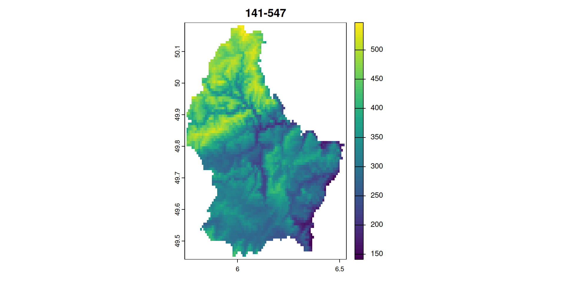 plot(elev, main = paste(minmax(elev),collapse = "-"))