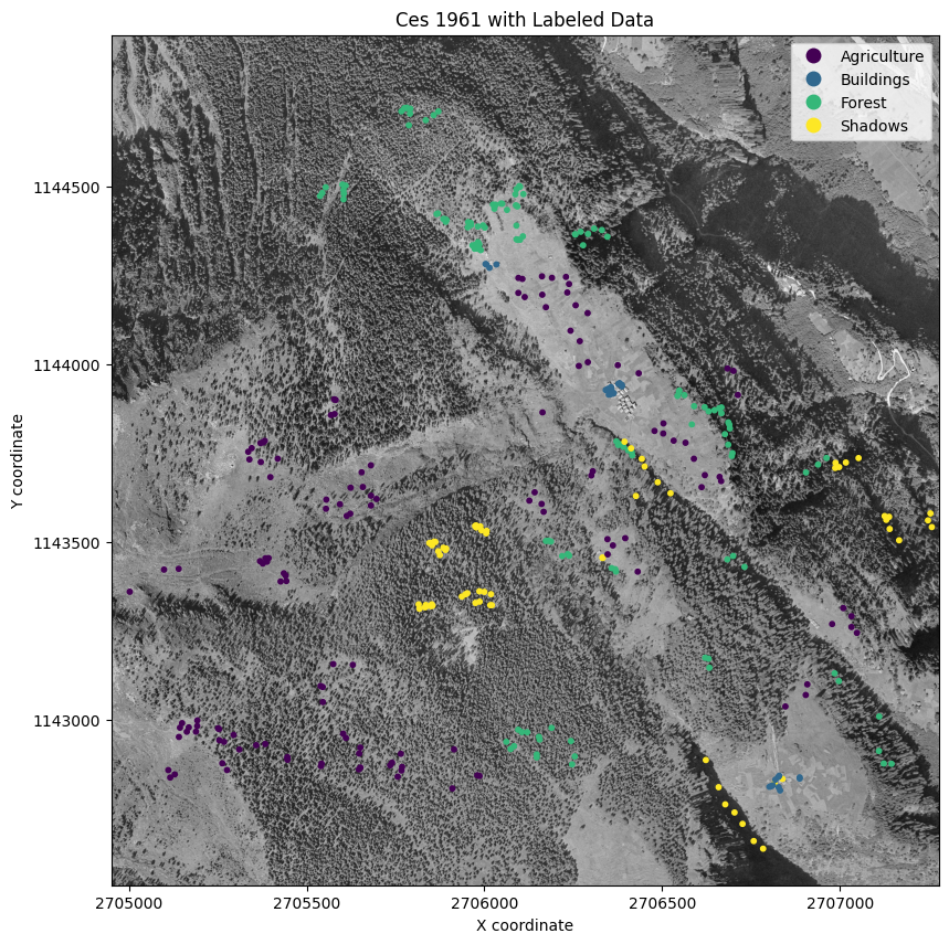 In preparation, I used QGIS to create labelled points for the following classes:
